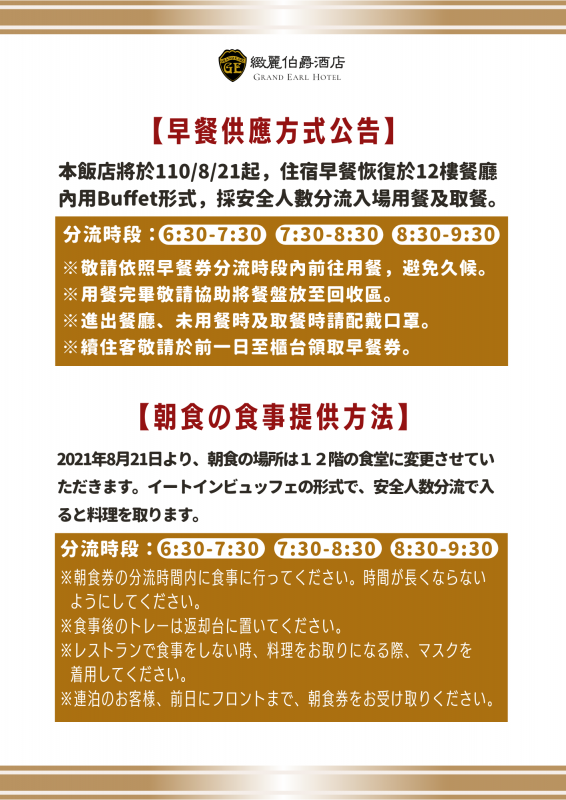 目前已恢復自助式Buffet,旅客亦可選擇早餐盒外帶,入住時需事先告知,並於指訂時段內前往取餐。